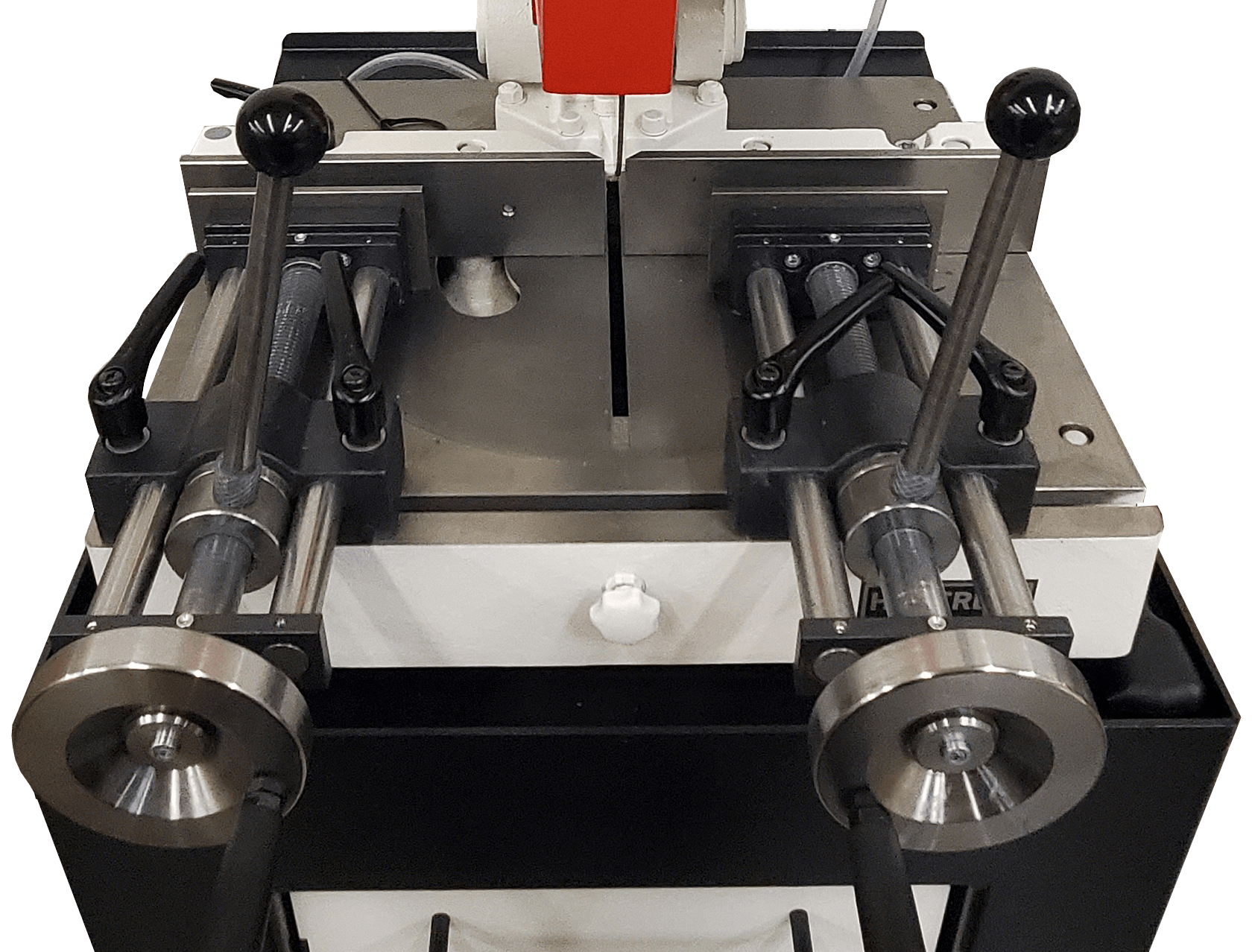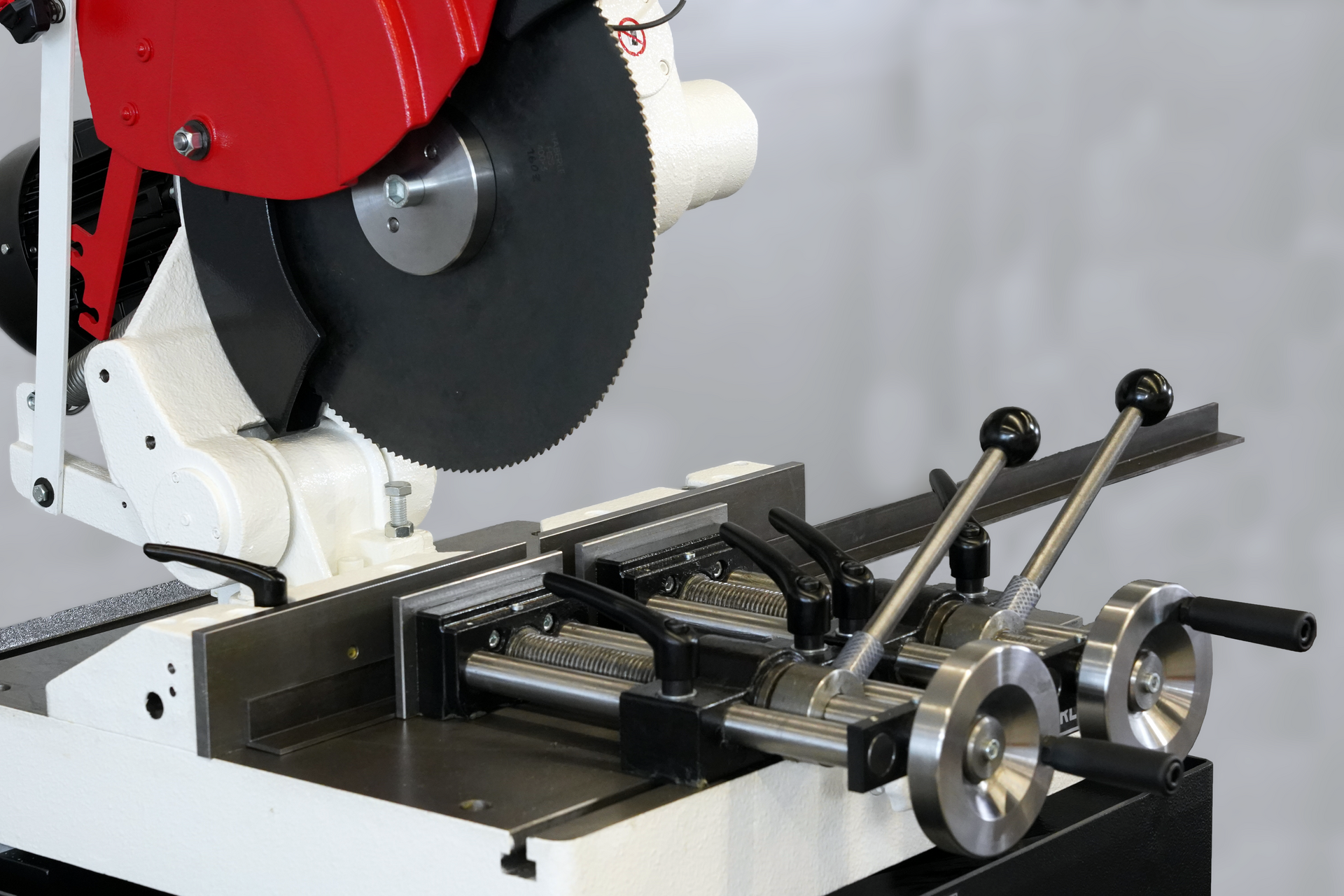 The strong double-grip vise allows burr-Iess straight cuts by clamping also the cut-off piece. For mitering cuts, the right arm can be taken off if necessary. Optional: Vise with quick-action lever.